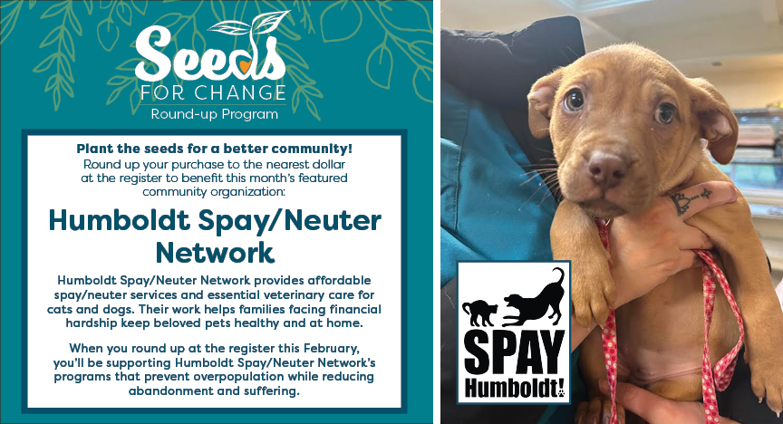 When you round up at the register this February, you’ll be supporting Humboldt Spay/Neuter Network’s programs that prevent overpopulation while reducing abandonment and suffering.