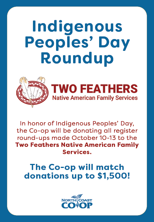 Celebrate Indigenous Peoples’ Day with the Co-op by supporting Two Feathers Native American Family Services, a local Native-led organization serving youth and families in Humboldt. From October 10 to 13, all register donations will go to Two Feathers, and the Co-op will match contributions up to $1,500.