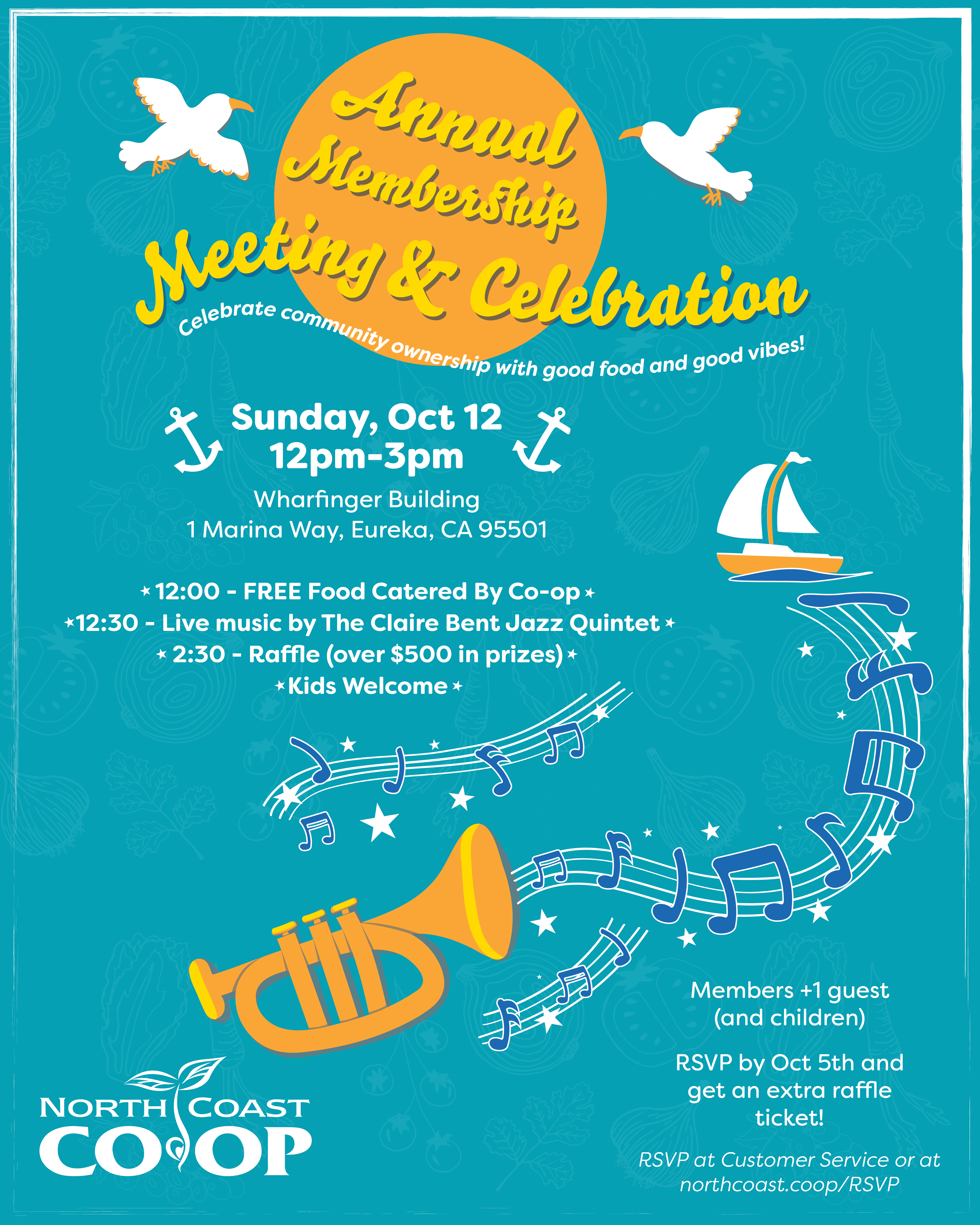 All Co-op members are invited to our 52nd Annual Membership Meeting & Celebration! Join us on Sunday, October 12, at 12:00 pm at the Wharfinger Building in Eureka to celebrate community ownership with good food and good vibes.