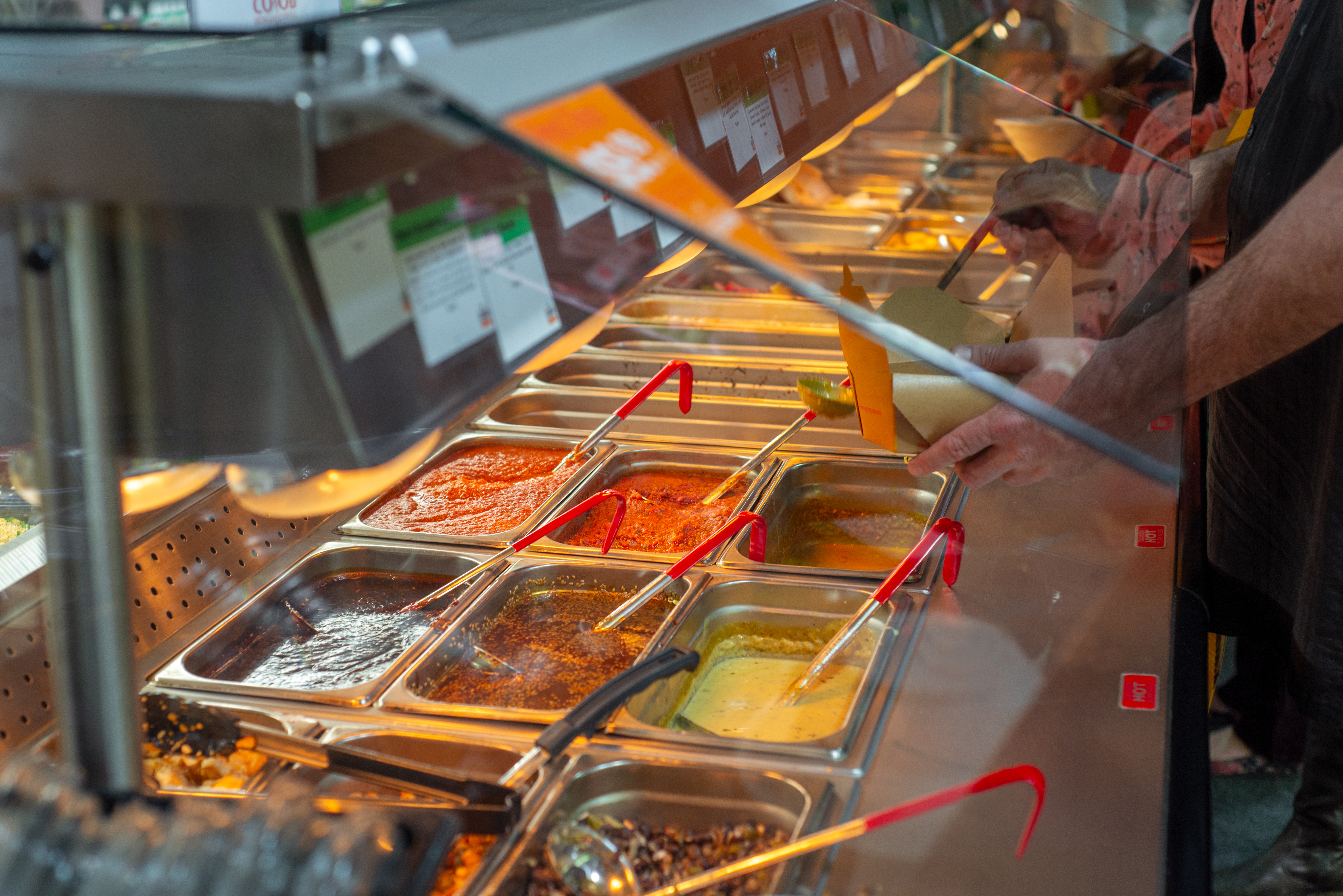 Left: Bourke, Deli Production Sr. Clerk, cooks Co-op chicken pot pies in Arcata. Right: Customers making sauce, grain, and protein choices at the new food bar in the Eureka store.